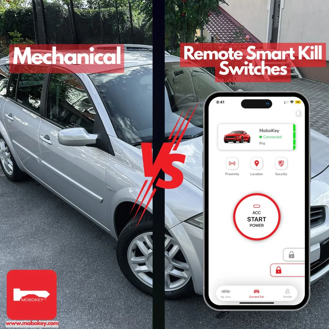 A remote smart kill switch, such as MoboKey, integrates with your car’s electrical system and is controlled entirely via your smartphone.